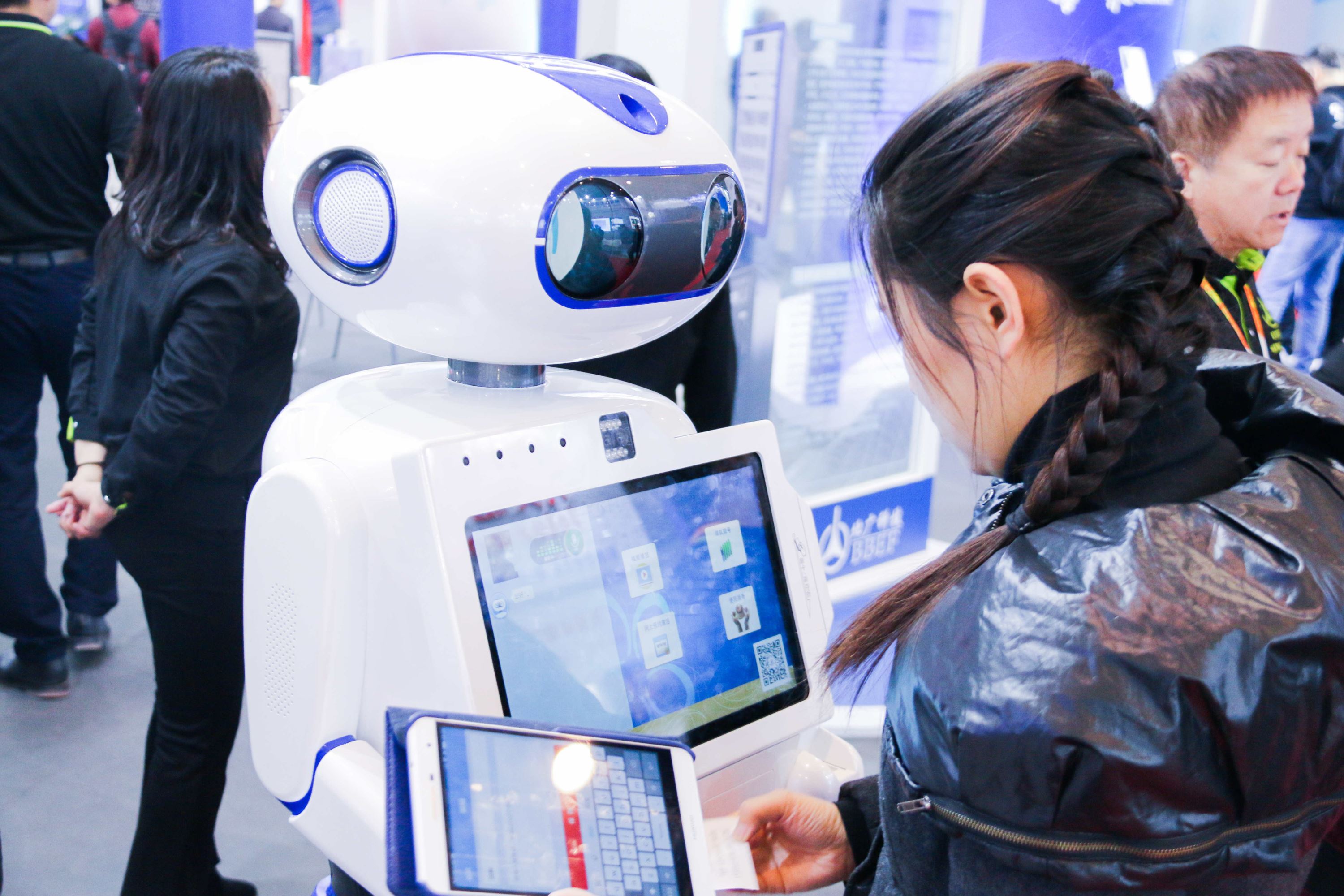 葉茂離不開根深,北廣科技的發展離不開兆維集團給予的幫忙和支持,在展區核心位置通過音頻、視頻、動態圖片、案例對集團進行全方位多角度介紹。服務機器人、警用機器人、送餐機器人、霧炮機器人等產品針對各個行業的特殊性進行定制,保障各行業快捷、方便、高效、安全地進行處置各類事務,F場的小服務員“小藍”引導和語音交互功能強大、專業的智能引領和咨詢講解服務得到了參觀人員的一致好評。
