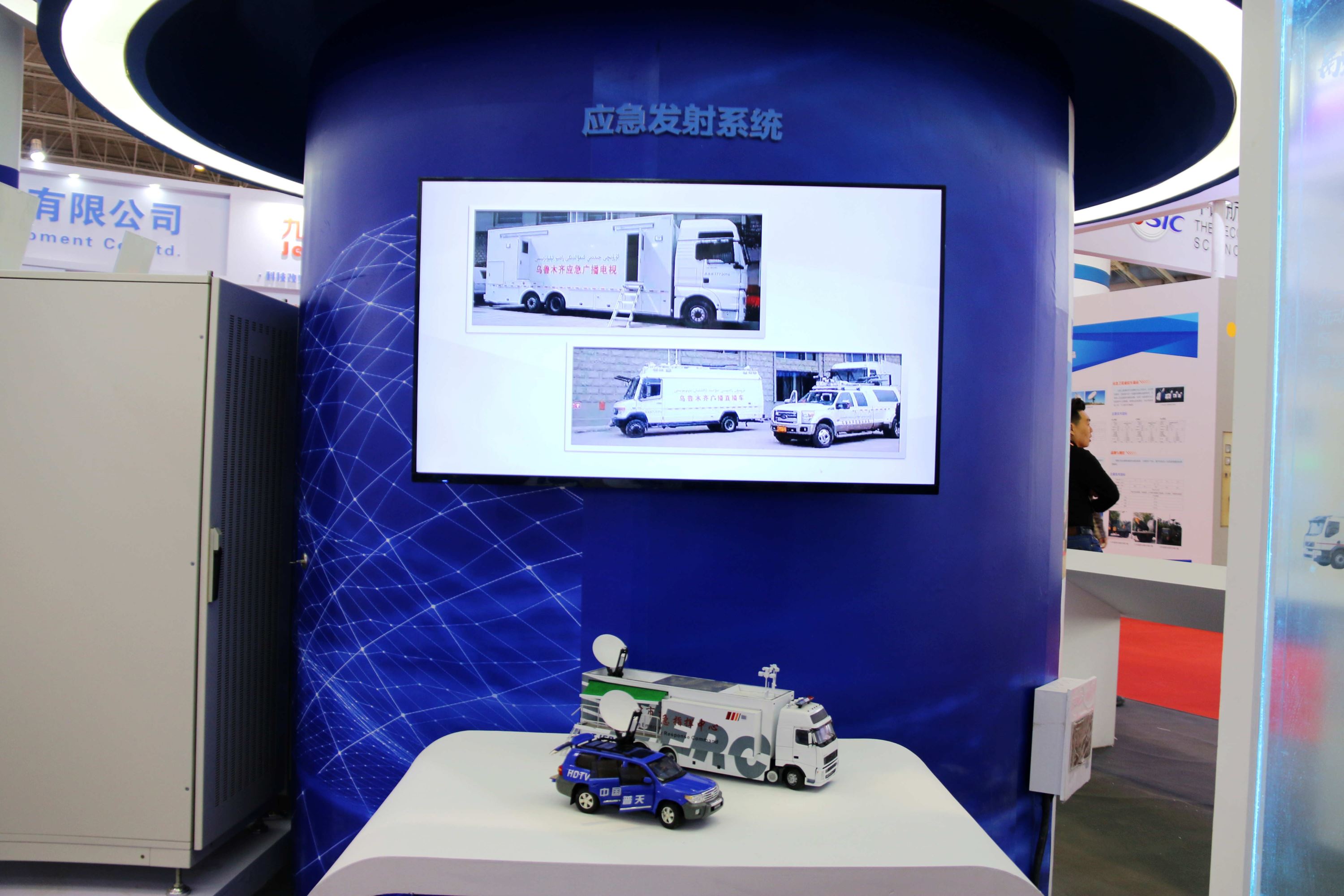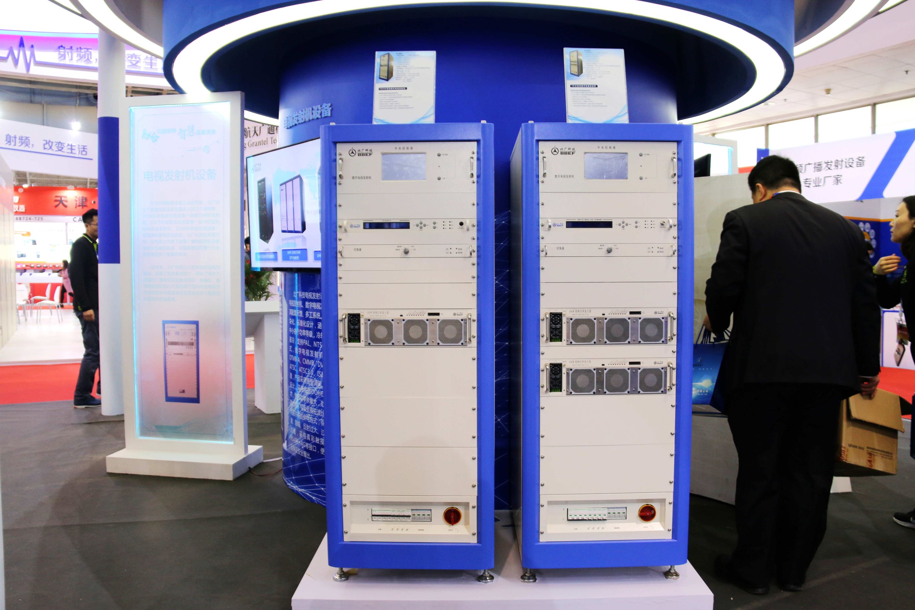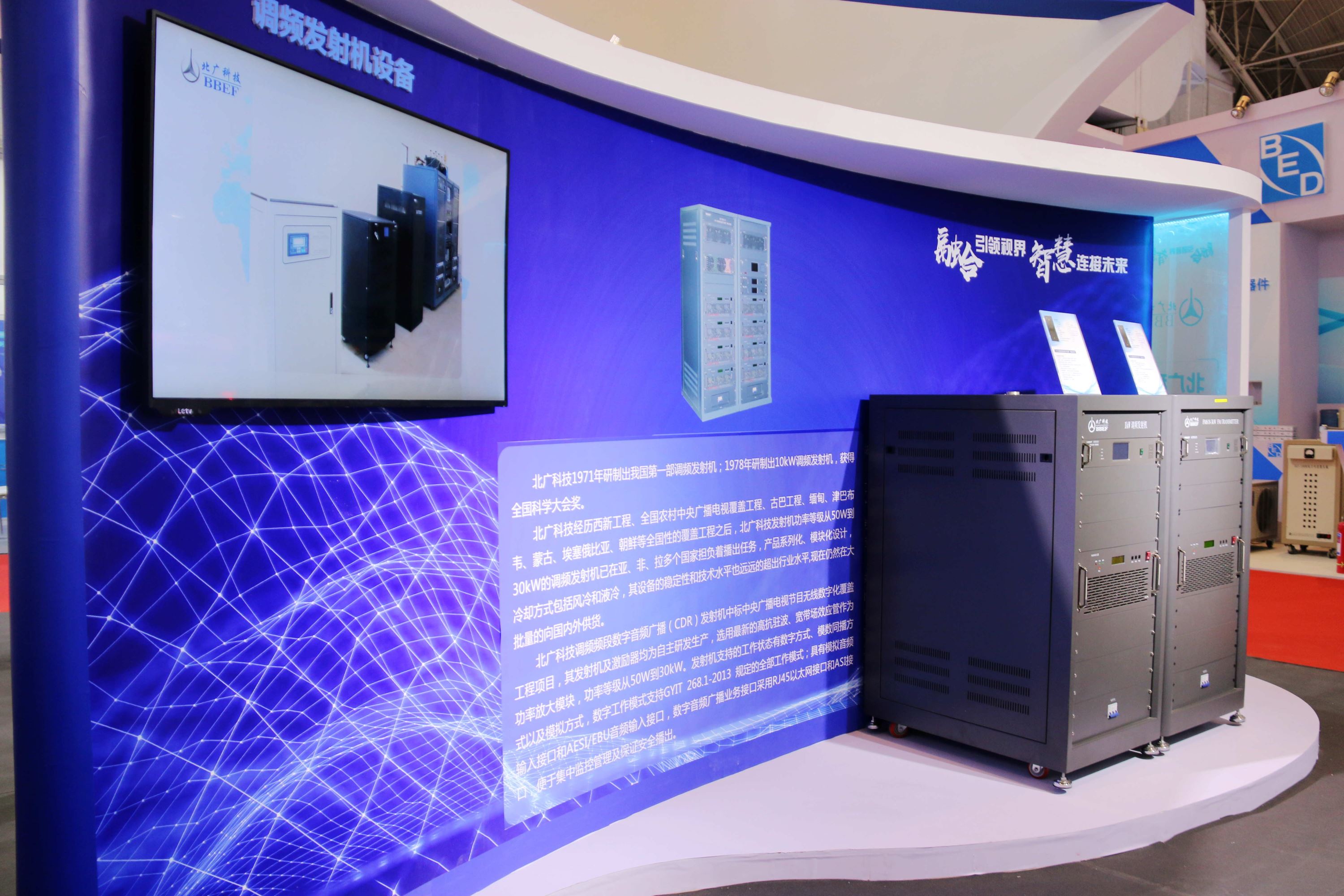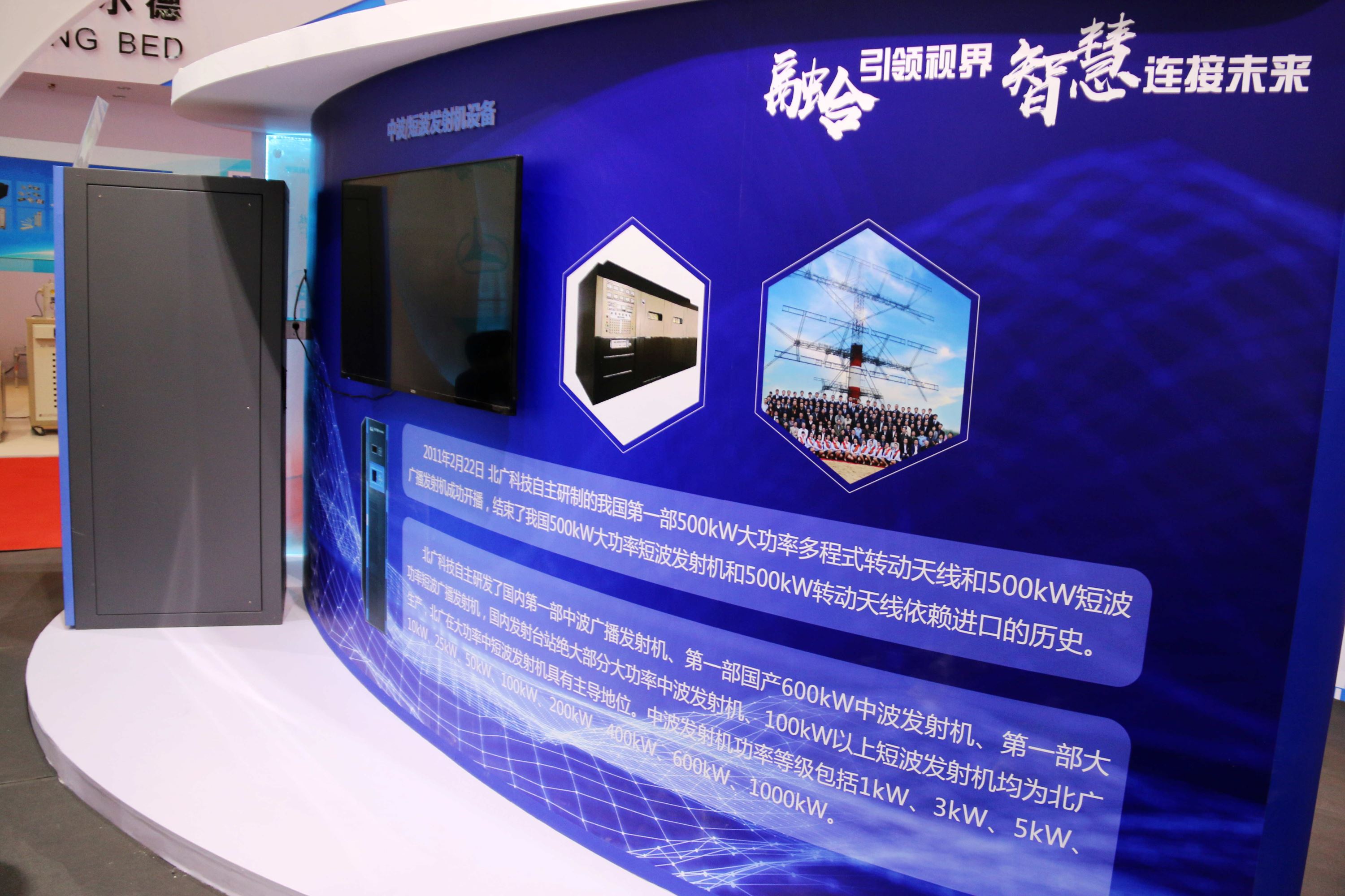 本屆展會我司展臺以“領航者號”為主旨設計,整體為一艘在海面上乘風破浪的科技巨輪,乘風破浪,揚帆遠航。此外展臺還精心規劃了四大展區,分別為電視發射機設備展區、調頻發射機設備展區、中波/短波發射機設備展區、應急發射系統展區。巧妙的展臺設計,一開展就吸引了大量觀眾駐足。本屆產品展示不僅有集高效率、高集成、智能化、模塊化于一身的數字電視發射機系列,也有作為時代的產品CDR數字音頻廣播發射機系列,功率等級由10W到10kW的全系列產品滿足客戶的各項需求。展區通過大量的視頻資料將北廣科技自主研發的中波發射機系列、短波發射機系列充分進行展示,各級功率等級機型近三十種。展出的應急廣播系統采用“數字播出、多網融合、編碼控制、尋址接收”的全新理念搭建數字化智能應急廣播平臺,真正實現在自然災害、突發事件、公共衛生與社會安全等突發公共危機時,提供一種迅速快捷的訊息傳輸通道,讓內外互通、解圍突困。