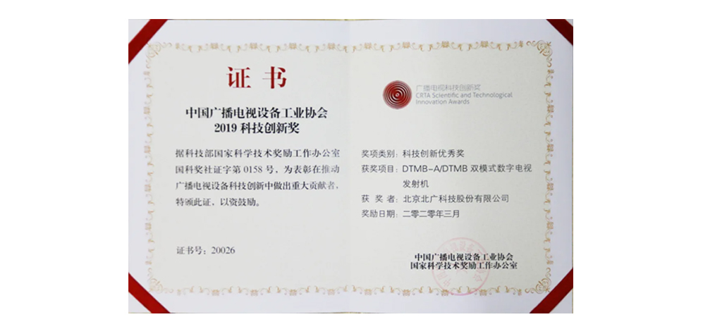 北廣科技DTMB-A/DTMB雙模式數(shù)字電視發(fā)射機榮獲2019年度中國廣播電視設(shè)備工業(yè)協(xié)會科技創(chuàng)新獎