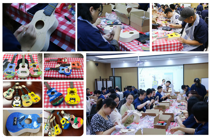 活動現場,在老師的引領下,一場尤克里里創意制作盛宴緩緩拉開序幕。首先,老師為大家詳細講解了尤克里里的歷史背景、基本構造及制作流程,隨后,大家便迫不及待地投入到了有趣的制作過程中,從小心翼翼地安裝琴身開始,每一步都充滿了挑戰與樂趣。繪畫圖案環節,職工們紛紛拿起畫筆,將心中的創意與情感傾注于琴身之上。有的人選擇了清新自然的風景畫,用細膩的筆觸勾勒出山川湖海的壯麗;有的人則偏愛抽象藝術,用大膽的色彩與線條表達內心的激情與自由;還有的人更是別出心裁,將動漫角色、卡通圖案等流行元素融入設計中,展現出獨特的個性風采。